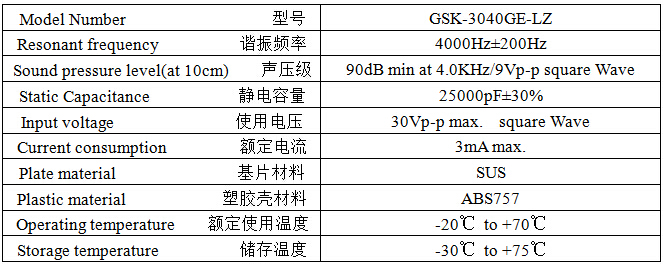 產(chǎn)品名稱: 壓電式無(wú)源蜂鳴器 30mm 4.0KHz引線