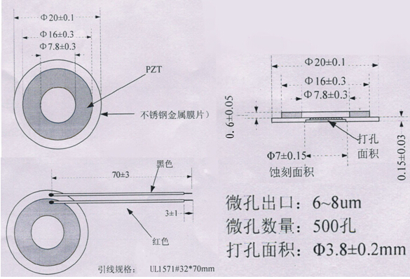 產品名稱: 超聲霧化片 帶鋼片 引線 113KHz 20mm